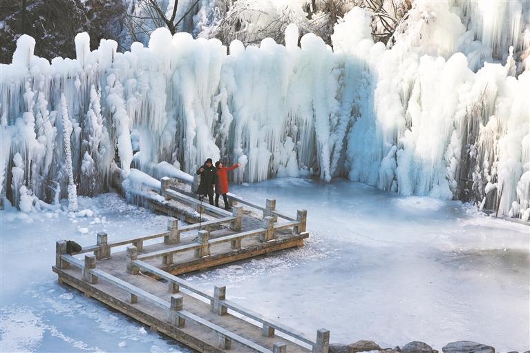 1月11日,“三秦四季·年味商洛”迎新春系列活动暨秦岭江山景区首届冰峰旅游季活动在商洛市商州区启幕。本次系列活动以“年味商洛·康养之旅”为主题,共精心策划34项、400余场次迎新春活动。图为1月11日,游客在商州区秦岭江山景区观赏冰瀑美景。
